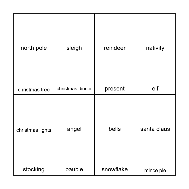 This bingo card has 16 words: bauble, santa claus, reindeer, north pole, christmas lights, sleigh, bells, snowflake, christmas tree, christmas dinner, stocking, nativity, angel, elf, present and mince pie.
