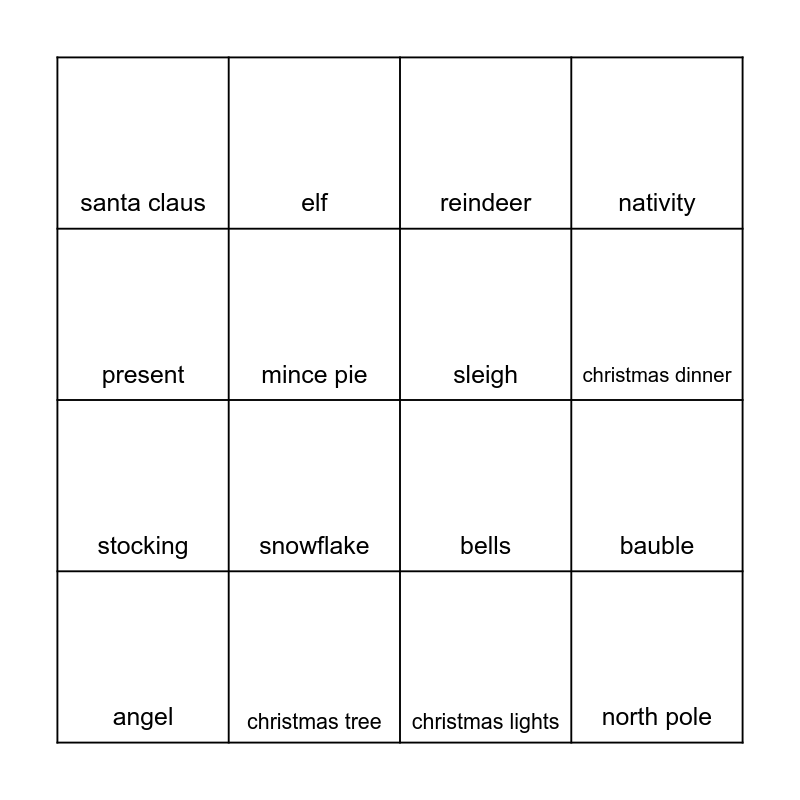 This bingo card has 16 words: christmas tree, bauble, reindeer, santa claus, stocking, elf, bells, christmas lights, present, mince pie, angel, nativity, snowflake, christmas dinner, sleigh and north pole.