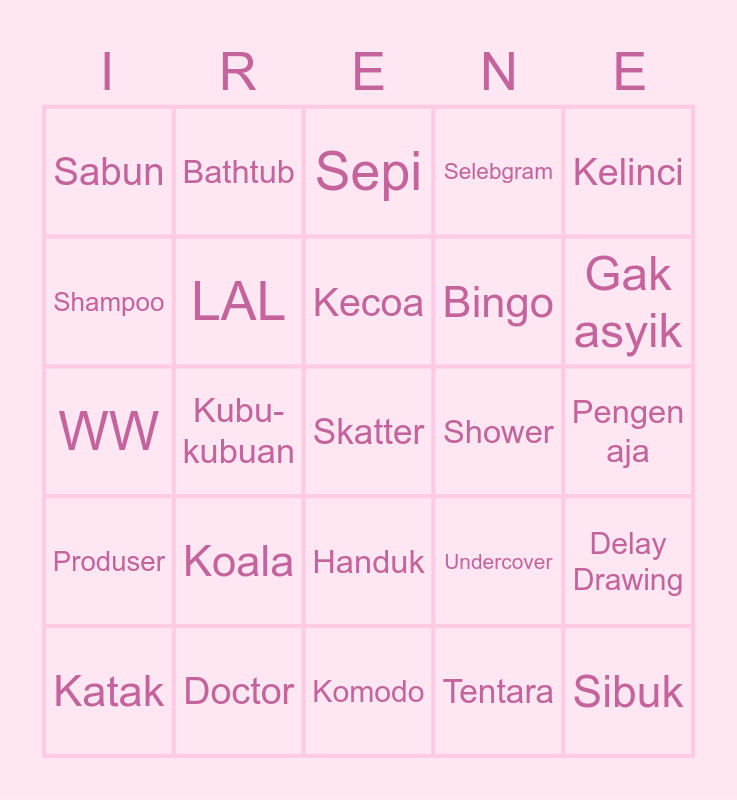 This bingo card has 25 words: Koala, Komodo, Kecoa, Katak, Kelinci, Sabun, Shampoo, Bathtub, Shower, Handuk, Bingo, WW, Undercover, Delay Drawing, LAL, Sibuk, Pengen aja, Sepi, Gak asyik, Kubu-kubuan, Skatter, Doctor, Produser, Selebgram and Tentara.