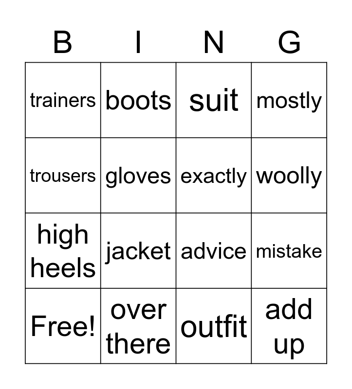 This bingo card has 23 words: add up, another, woolly, pair, trousers, trainers, gloves, boots, Free!, beach, jacket, high heels, kit, wrong, over there, baggy, suit, advice, exactly, mistake, mostly, outfit and unusual.