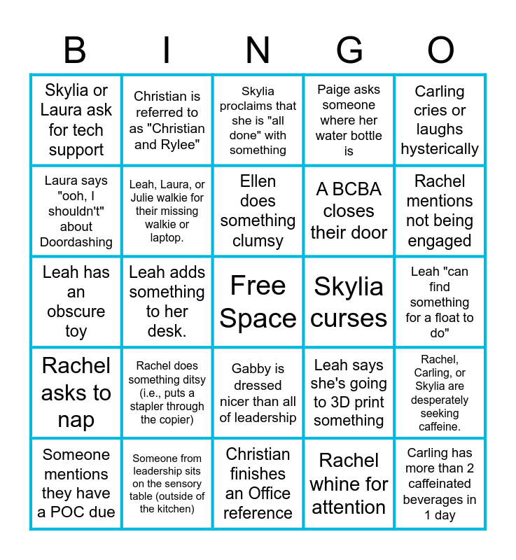 This bingo card has a free space and 44 words: Someone asks 'who is that?' in reference to a kid's cry, scream, or behavior, Carling has more than 2 caffeinated beverages in 1 day, Rachel mentions Oakley, Someone mentions they have a POC due, Ellen talks about one of her obsessions (i.e., jobros, disney, makeup, dogs, cricut), Rachel whine for attention, Skylia proclaims that she is "all done" with something, Julie asks what the theme day is, Carling cries or laughs hysterically, Someone from leadership sits on the sensory table (outside of the kitchen), Paige asks someone where her water bottle is, Skylia curses, Gabby is dressed nicer than all of leadership, Rachel does something ditsy (i.e., puts a stapler through the copier), Carling or Rachel say that they're cold, Christian finishes an Office reference, Gabby sings TikTok hits, Leah has an obscure toy, Paige walkies for anyone from Leadership, Rachel mentions not being engaged, Christian is referred to as "Christian and Rylee", Paige has Skyline for lunch, Gabby wears slippers/slides, Skylia or Laura ask for tech support, Carling reheats her breakfast sandwich, Leah "can find something for a float to do", Paige has hot sauce, Carling has on 3+ layers, Leah says she's going to 3D print something, Rachel asks to nap, Ellen updates you on Keeping Up with the Iannis., Rachel, Carling, or Skylia are desperately seeking caffeine., Kelli wears neon, Gabby orders lunch even though she packed her lunch, Leah adds something to her desk., Someone finds the underwear, Rachel says "I don't wanna", Leah or Julie ask "who was that for?" in response to any walkie call, Ellen does something clumsy, Laura says "ooh, I shouldn't" about Doordashing, A BCBA closes their door, Tabitha talks someone in Leadership into giving her something of theirs, Leah, Laura, or Julie walkie for their missing walkie or laptop. and Someone in leadership asks if someone else wants to Doordash..