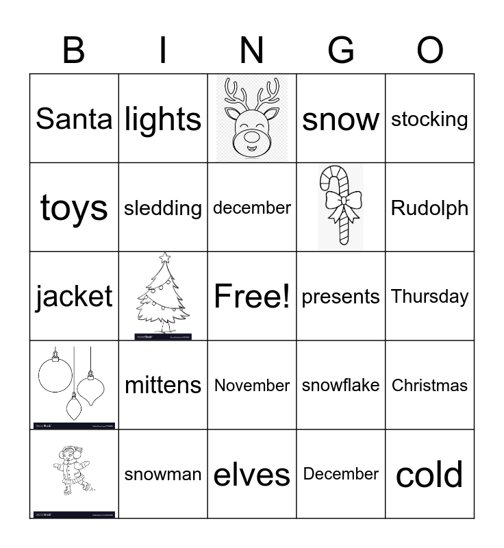This bingo card has 5 images, a free space and 19 words: mittens, snowman, december, stocking, Santa, toys, lights, presents, November, jacket, snowflake, Christmas, sledding, December, Thursday, Rudolph, cold, snow and elves.