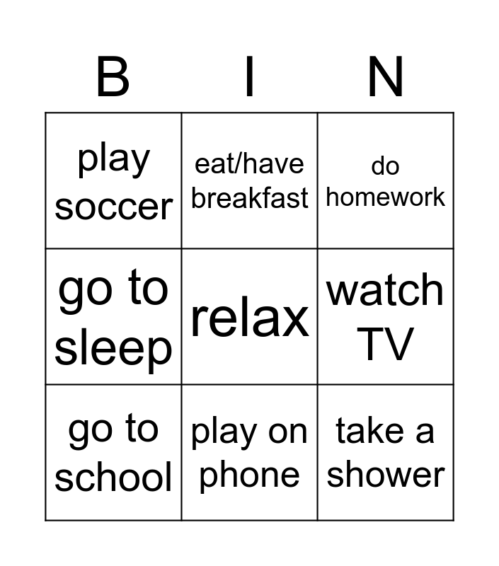 This bingo card has 21 words: wake up, get dressed, eat/have breakfast, brush teeth, wash dishes, go to school, play soccer, do homework, cook dinner, play on phone, take a shower, go to sleep, work, clean, watch TV, meet friends, read, drink, relax, listen to music and exercise.