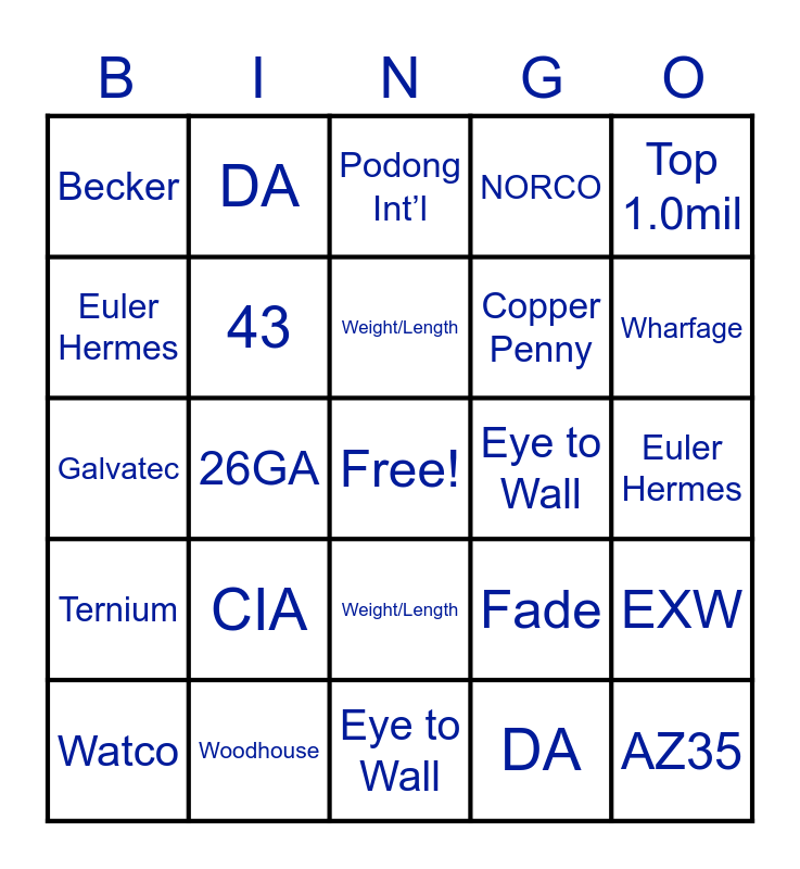 This bingo card has a free space and 60 words: Ports America, Woodhouse, Precoat, Ternium, DA, GR50, 43, 26GA, Copper Penny, Galvatec, NORCO, CIA, Euler Hermes, Hakata Queen v2172E, Fade, Becker, AZ35, Top 1.0mil, Chicken house, Weight/Length, Eye to Wall, Podong Int’l, Watco, EXW, Passion, Back to Back, FILO, Galvanized, Wharfage, Trucking, Ports America, Woodhouse, Precoat, Ternium, DA, GR50, 43, 26GA, Copper Penny, Galvatec, NORCO, CIA, Euler Hermes, Hakata Queen v2172E, Fade, Becker, AZ35, Top 1.0mil/Back 0.5mil, Chicken house, Weight/Length, Eye to Wall, Podong Int’l, Watco, EXW, Passion, Back to Back, FILO, Galvanized, Wharfage and Trucking.