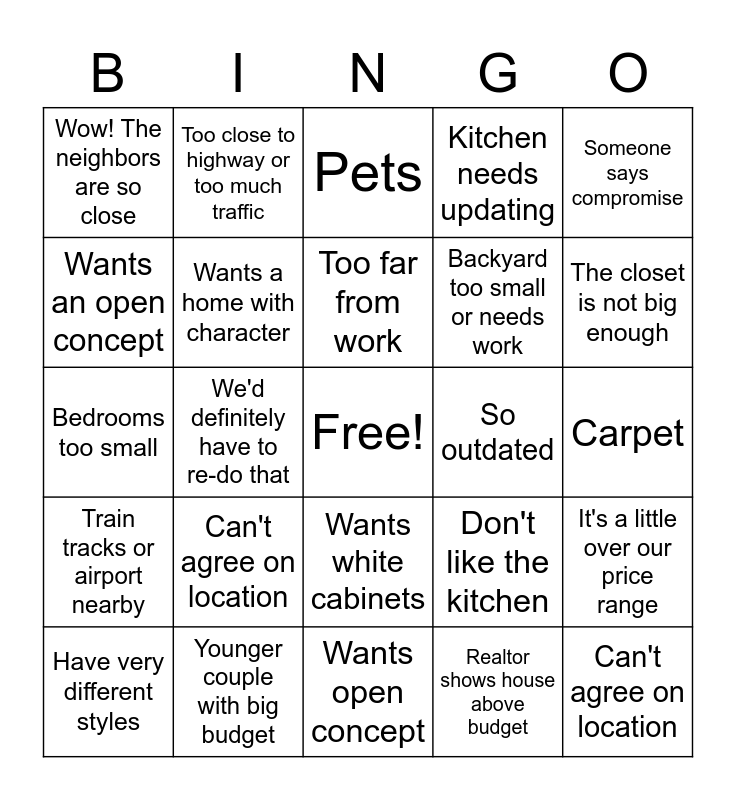 This bingo card has a free space and 24 words: Can't agree on location, Younger couple with big budget, Too far from work, Have very different styles, Someone says compromise, Wow! The neighbors are so close, Wants an open concept, Too close to highway or too much traffic, So outdated, Wants white cabinets, Backyard too small or needs work, Bedrooms too small, Don't like the kitchen, It's a little over our price range, Wants a home with character, Realtor shows house above budget, Carpet, Pets, The closet is not big enough, We'd definitely have to re-do that, Can't agree on location, Train tracks or airport nearby, Kitchen needs updating and Wants open concept.