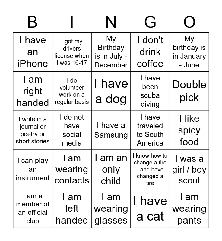 This bingo card has 35 words: I have more than 1 sibling, 1 have more than 3 social media accounts, I run at least twice a week, I do volunteer work on a regular basis, I am an only child, I don't drink coffee, I am right handed, I can speak a foreign language fluently, I have a dog, I have traveled to Europe, I write in a journal or poetry or short stories, My birthday is in January - June, Free!, I have a tattoo, I have an iPhone, I have traveled to South America, I have a cat, I do not have social media, I can play an instrument, I have a Samsung, I know how to change a tire - and have changed a tire, I am a member of an official club, I was a girl / boy scout, I am left handed, My Birthday is in July - December, Double pick, I am wearing pants, I have country line danced, I have been scuba diving, I like spicy food, Move a square, I am wearing glasses, I am wearing contacts, I got my drivers license when I was 16-17 and I am afraid of a type of animal.