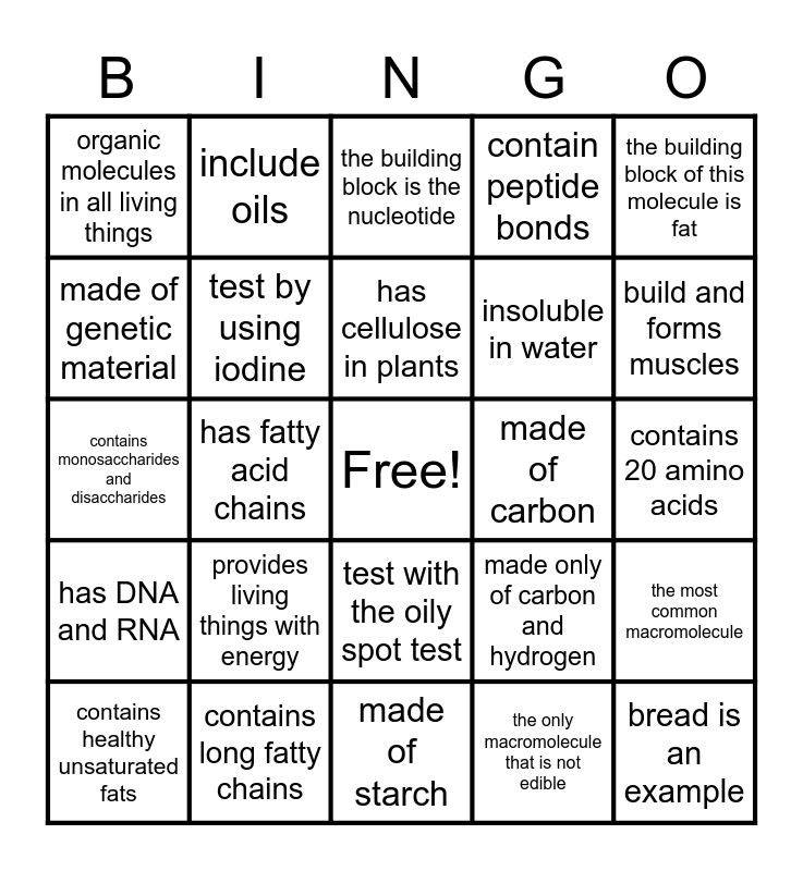 This bingo card has a free space and 29 words: contains healthy unsaturated fats, made of carbon, hydrogen and oxygen, has fatty acid chains, butter is an example, organic molecules in all living things, the building block is the nucleotide, test by using iodine, provides living things with energy, made of carbon, contains long fatty chains, contains 20 amino acids, bread is an example, made of starch, the only macromolecule that is not edible, build and forms muscles, has building blocks of amino acids, test with the oily spot test, has DNA and RNA, the building block of this molecule is fat, contains monosaccharides and disaccharides, made only of carbon and hydrogen, sometimes called polymers, insoluble in water, made of genetic material, contain peptide bonds, include oils, the most common macromolecule, has cellulose in plants and has glycogen in animals.