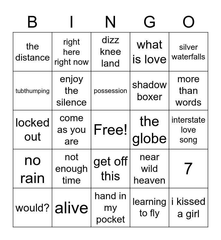 This bingo card has a free space and 30 words: alive, bittersweet, come as you are, cornflake girl, the distance, dizz knee land, enjoy the silence, get off this, the globe, hand in my pocket, interstate love song, i kissed a girl, learning to fly, lump, more than words, naked eye, near wild heaven, no rain, not enough time, silver waterfalls, locked out, steal my sunshine, right here right now, shadow boxer, tubthumping, what is love, 7, would?, possession and human behavior.