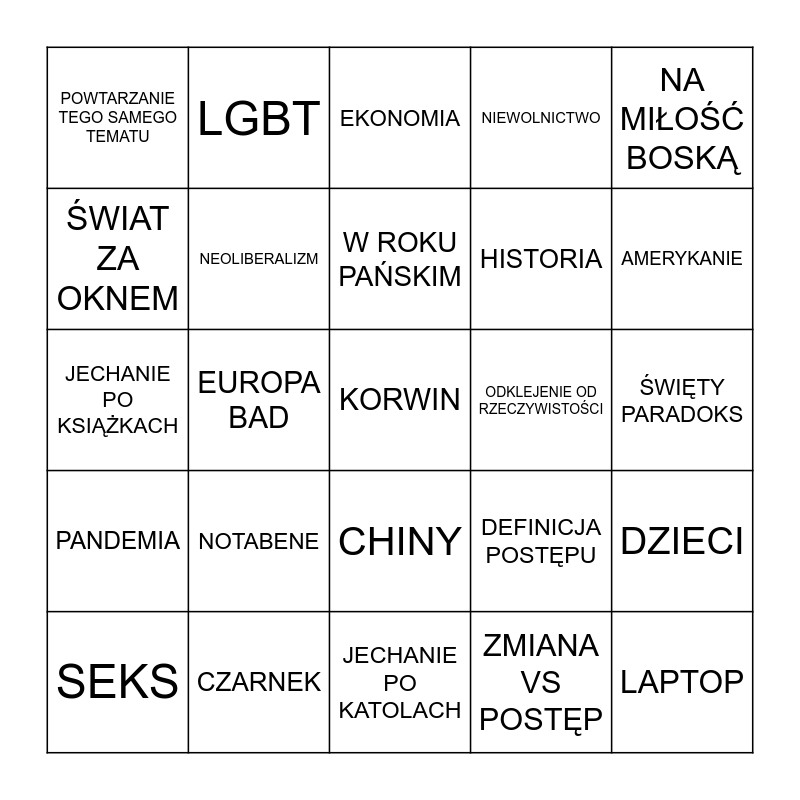 This bingo card has 25 words: NOTABENE, JECHANIE PO KATOLACH, W ROKU PAŃSKIM, SEKS, NA MIŁOŚĆ BOSKĄ, POWTARZANIE TEGO SAMEGO TEMATU, ŚWIAT ZA OKNEM, LGBT, ODKLEJENIE OD RZECZYWISTOŚCI, CHINY, HISTORIA, JECHANIE PO KSIĄŻKACH, DEFINICJA POSTĘPU, DZIECI, NEOLIBERALIZM, LAPTOP, ŚWIĘTY PARADOKS, EKONOMIA, AMERYKANIE, EUROPA BAD, KORWIN, CZARNEK, PANDEMIA, NIEWOLNICTWO and ZMIANA VS POSTĘP.