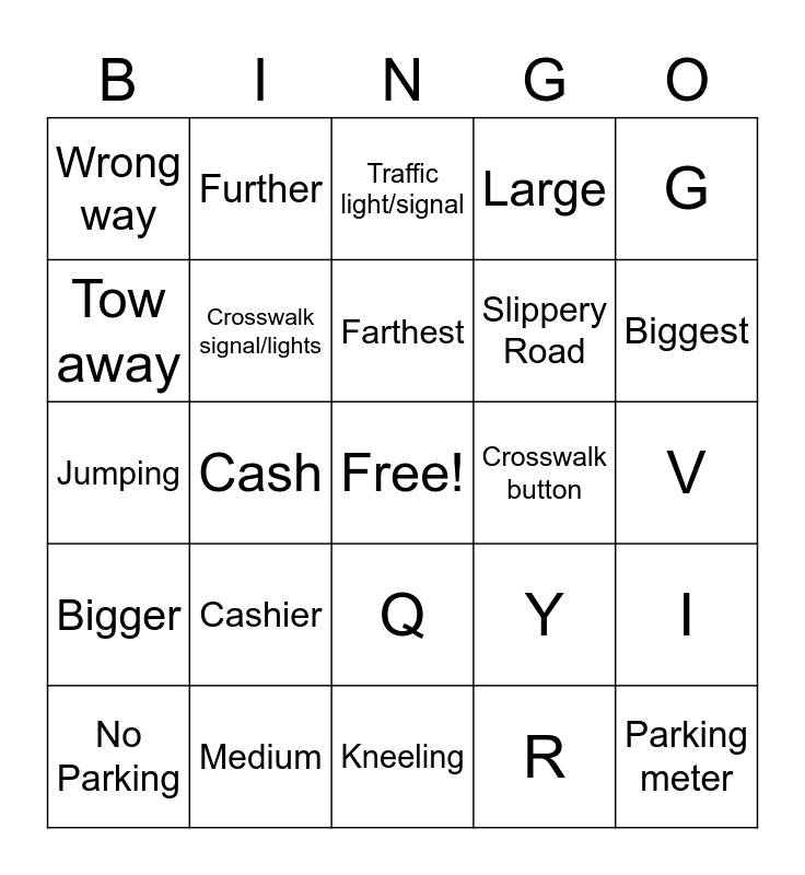 This bingo card has a free space and 85 words: Street signs, Stop sign, Traffic light/signal, Green- Go, Red- Stop, Speed limit, One Way, No U turn, No Passing Zone, Yield, Crosswalk, Crosswalk sign, Crosswalk signal/lights, Crosswalk button, Do Not Enter, Wrong way, No Parking, Tow away, Dead End, Roadwork ahead, Road work, Slippery Road, Parking meter, Parking meter for credit cards, Cash, Credit card, Check, Check book, Shopping cart, Self check out, Cashier, Money, Running, Jumping, Sliding, Catching, Kneeling, Big, Bigger, Biggest, Small, Smaller, Smallest, Cheap, Affordable, Expensive, Good, Better, Best, Far, Further, Farthest, Tall, Taller, Tallest, Small, Medium, Large, Bad, A, B, C, D, E, F, G, H, I, J, K, L, M, N, O, P, Q, R, S, T, U, V, W, X, Y and Z.
