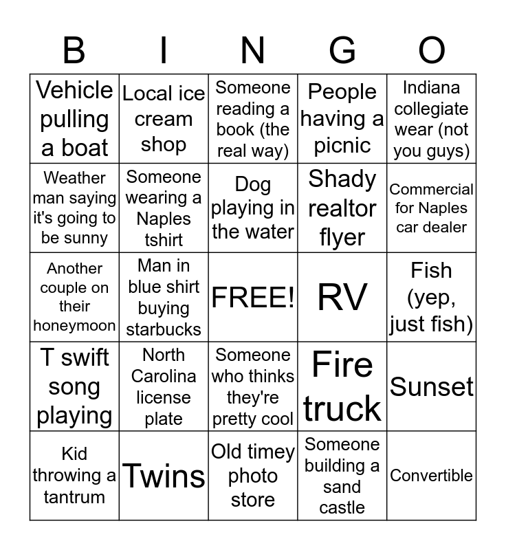 This bingo card has a free space and 24 words: North Carolina license plate, Twins, Dog playing in the water, Kid throwing a tantrum, Indiana collegiate wear (not you guys), Vehicle pulling a boat, Weather man saying it's going to be sunny, Local ice cream shop, RV, Someone who thinks they're pretty cool, Shady realtor flyer, Another couple on their honeymoon, Fire truck, Sunset, Someone wearing a Naples tshirt, Someone building a sand castle, Fish (yep, just fish), Someone reading a book (the real way), Commercial for Naples car dealer, Man in blue shirt buying starbucks, Convertible, T swift song playing, People having a picnic and Old timey photo store.