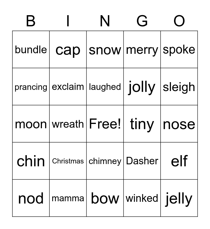 This bingo card has a free space and 24 words: Christmas, mamma, laughed, nod, spoke, bundle, prancing, cap, tiny, chimney, jolly, moon, Dasher, elf, exclaim, winked, nose, snow, sleigh, wreath, jelly, chin, merry and bow.