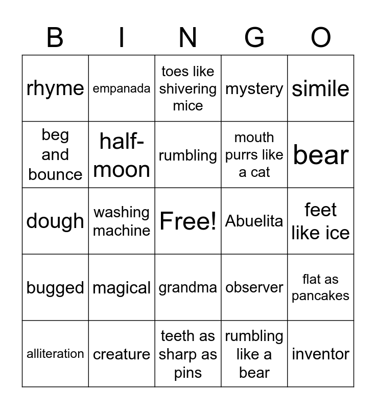 This bingo card has a free space and 24 words: magical, creature, rumbling, alliteration, simile, rhyme, beg and bounce, empanada, Abuelita, grandma, mouth purrs like a cat, dough, observer, flat as pancakes, half- moon, rumbling like a bear, feet like ice, toes like shivering mice, bear, washing machine, inventor, bugged, mystery and teeth as sharp as pins.