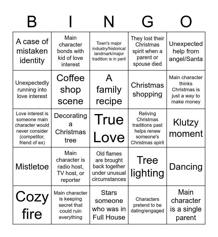 This bingo card has a free space and 44 words: Trip to a Christmas tree lot, Main character is a single parent, Main character is a workaholic, Cozy fire, Setting is a Christmas-obsessed town, Characters pretend to be dating/engaged, Town's major industry/historical landmark/major tradition is in peril, Character from the big city grows to love small-town life, Unexpected help from angel/Santa, Main character is keeping secret that could ruin everything, They lost their Christmas spirit when a parent or spouse died, Reliving Christmas traditions past helps renew someone's Christmas spirit, Old flames are brought back together under unusual circumstances, Main character is radio host, TV host, or reporter, Main character is interior decorator, clothes designer or artist, Stars someone who was in Full House, Secret admirer is big plot point, Love interest is someone main character would never consider (competitor, friend of ex), Bad relationship with mom or dad, Main character thinks Christmas is just a way to make money, Main character bonds with kid of love interest, Snowstorm causes transportation delays/problems, This is the first time they've felt this way since their spouse died, A case of mistaken identity, Big career moment, Klutzy moment, near miss kiss, Ice skating scene, Tree lighting, Mistletoe, Child is a perfectly behaved angel, Dancing, Hot cocoa or egg nog, Aloof boyfriend, Decorating a Christmas tree, "It's snowing", Carol singing, A cute pet dog, A family recipe, Unexpectedly running into love interest, Christmas shopping, Main character can't stay in town for long, Coffee shop scene and Love interest comes to her rescue by doing something manly.