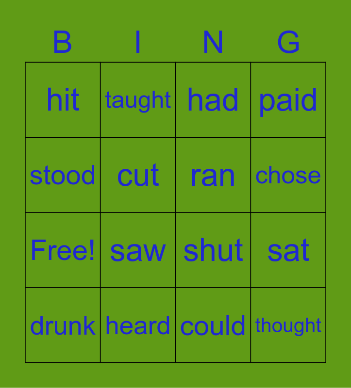 This bingo card has 20 words: sat, drew, had, ate, drunk, stood, heard, hit, Free!, taught, saw, shut, cut, thought, ran, took, chose, paid, could and sang.