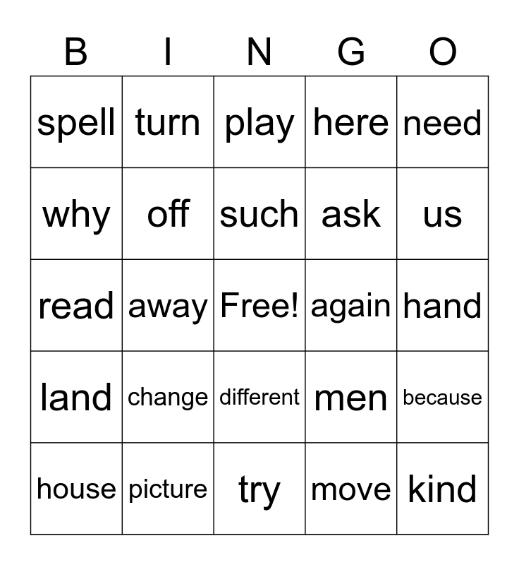 This bingo card has a free space and 29 words: house, animal, away, air, spell, play, off, change, again, picture, hand, kind, try, move, us, home, different, land, need, read, men, went, ask, why, here, turn, because, such and even.