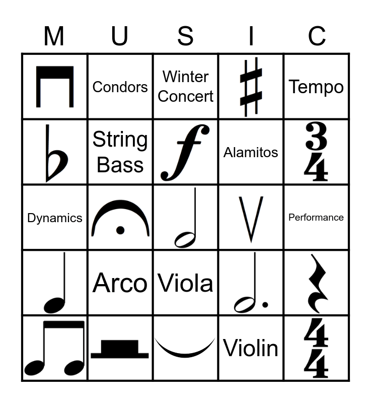 This bingo card has 20 images and 15 words: String Bass, Viola, Dynamics, Tempo, Beginning Strings, Cello, Violin, Winter Concert, Pizzicato, Alamitos, Performance, Bowing, Arco, Condors and Advanced Strings.