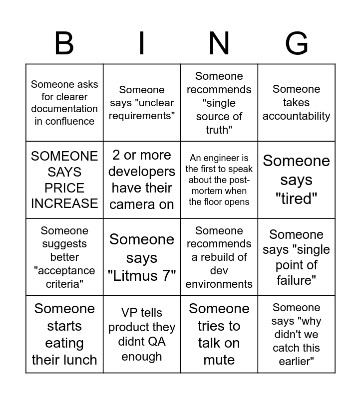 This bingo card has 16 words: VP tells product they didnt QA enough, Someone says "single point of failure", Someone recommends "single source of truth", Someone asks for clearer documentation in confluence, Someone suggests better "acceptance criteria", Someone says "unclear requirements", Someone recommends a rebuild of dev environments, Someone tries to talk on mute, SOMEONE SAYS PRICE INCREASE, 2 or more developers have their camera on, Someone starts eating their lunch, Someone takes accountability, Someone says "Litmus 7", Someone says "tired", An engineer is the first to speak about the post-mortem when the floor opens and Someone says "why didn't we catch this earlier".