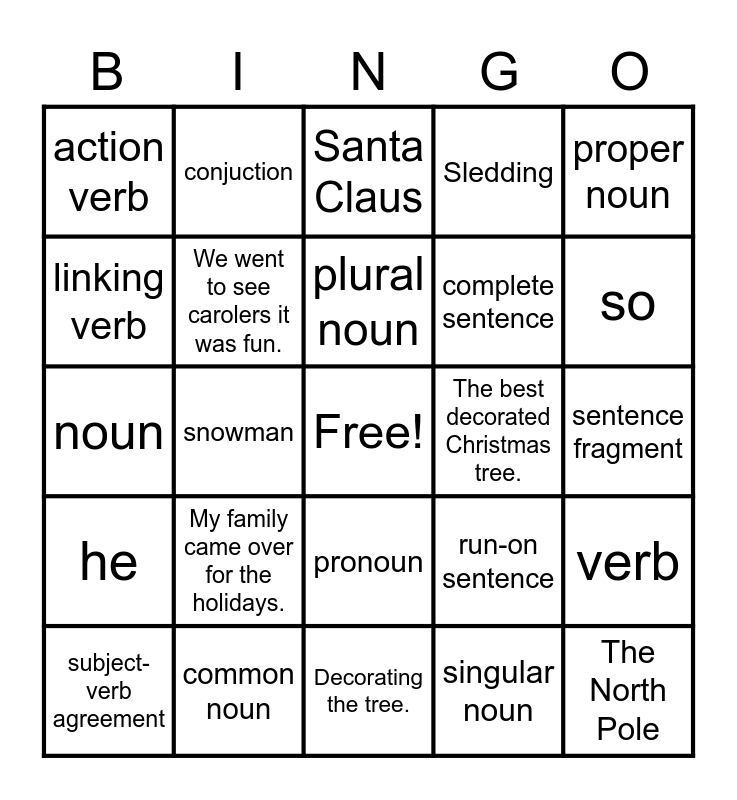 This bingo card has a free space and 26 words: pronoun, singular noun, plural noun, common noun, proper noun, action verb, linking verb, conjuction, sentence fragment, run-on sentence, complete sentence, noun, verb, subject-verb agreement, snowman, snow angels, Sledding, he, Santa Claus, The North Pole, so, Decorating the tree., The best decorated Christmas tree., My family came over for the holidays., We went to see carolers it was fun. and capital letter.