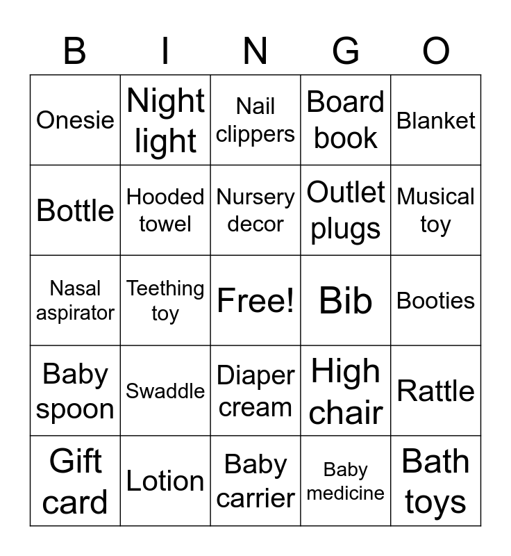 This bingo card has a free space and 35 words: Pacifier, Swing, Picture frame, Hooded towel, Diaper cream, Board book, Bottle, Photo album, Nursery decor, Burp cloths, Nasal aspirator, Blanket, Termometer, Diaper pail, Onesie, Bib, Baby medicine, Teething toy, Baby spoon, Bath toys, High chair, Gift card, Rattle, Lotion, Nail clippers, Musical toy, Sleeper, Piggy bank, Outlet plugs, Booties, Changing pad, Baby carrier, Swaddle, Night light and Hat.