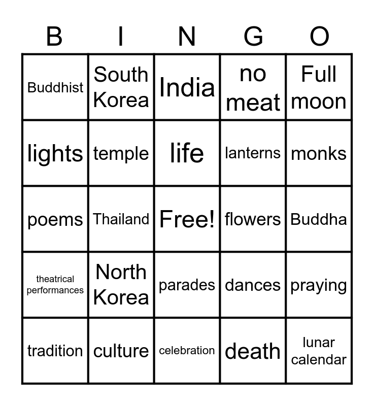 This bingo card has a free space and 30 words: culture, deep meditation, Thailand, puppet shows, Buddhist, India, temple, parades, flowers, celebration, Buddha, lunar calendar, death, food, monks, Vesak, dances, theatrical performances, North Korea, Full moon, poems, birth, South Korea, lanterns, lights, no meat, praying, tradition, life and statues.