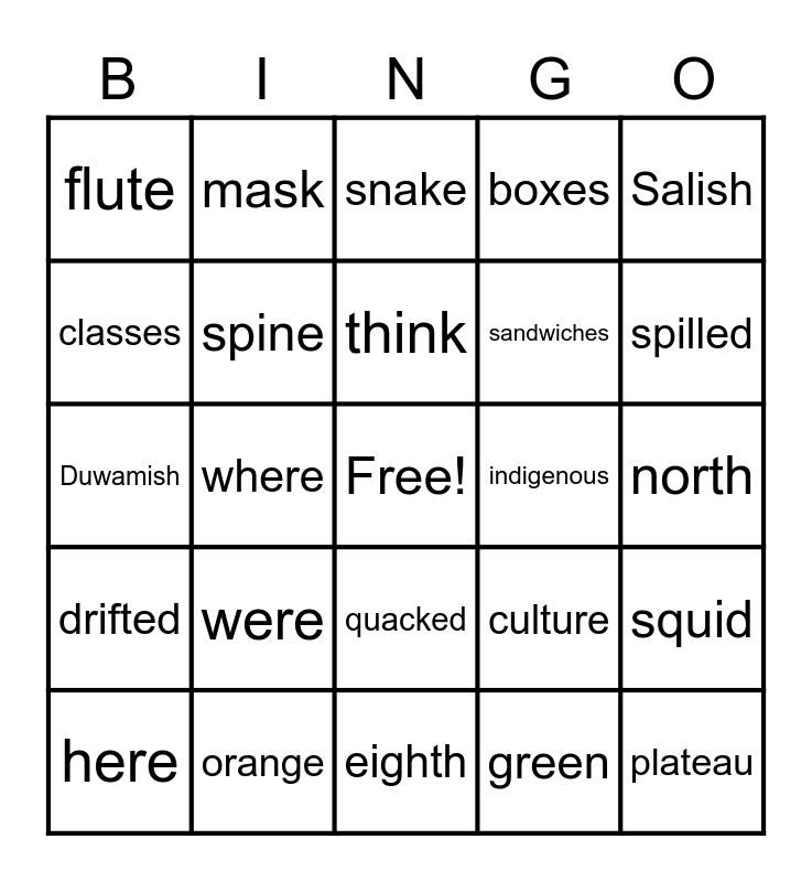 This bingo card has a free space and 29 words: here, there, where, prize, flute, snake, spine, were, indigenous, orange, north, plateau, eighth, green, spilled, squished, quacked, drifted, Salish, Duwamish, culture, foxes, sandwiches, classes, boxes, mask, squid, think and was.