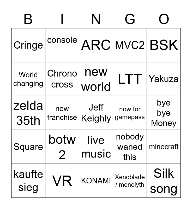 This bingo card has a free space and 24 words: botw 2, VR, new world, kaufte sieg, BSK, Cringe, World changing, console, now for gamepass, live music, LTT, zelda 35th, nobody waned this, minecraft, Chrono cross, Xenoblade / monolyth, bye bye Money, ARC, Yakuza, new franchise, Silk song, Square, MVC2 and KONAMI.