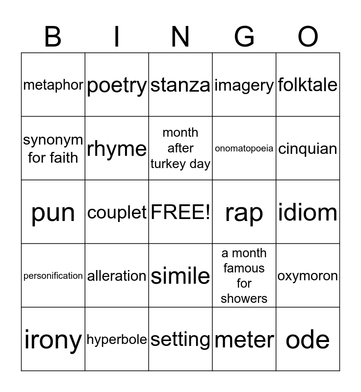 This bingo card has a free space and 24 words: alleration, hyperbole, month after turkey day, irony, folktale, metaphor, synonym for faith, poetry, rap, simile, onomatopoeia, pun, a month famous for showers, oxymoron, rhyme, meter, idiom, stanza, cinquian, couplet, ode, personification, imagery and setting.