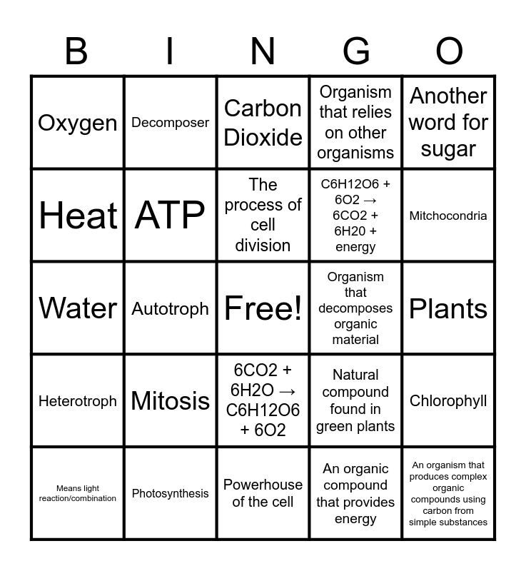 This bingo card has a free space and 24 words: Mitosis, Photosynthesis, The process of cell division, Means light reaction/combination, Another word for sugar, Oxygen, Heat, Decomposer, Organism that decomposes organic material, 6CO2 + 6H2O → C6H12O6 + 6O2, C6H12O6 + 6O2 → 6CO2 + 6H20 + energy, Water, Natural compound found in green plants, Chlorophyll, ATP, An organic compound that provides energy, Plants, Carbon Dioxide, Mitchocondria, Autotroph, An organism that produces complex organic compounds using carbon from simple substances, Heterotroph, Organism that relies on other organisms and Powerhouse of the cell.