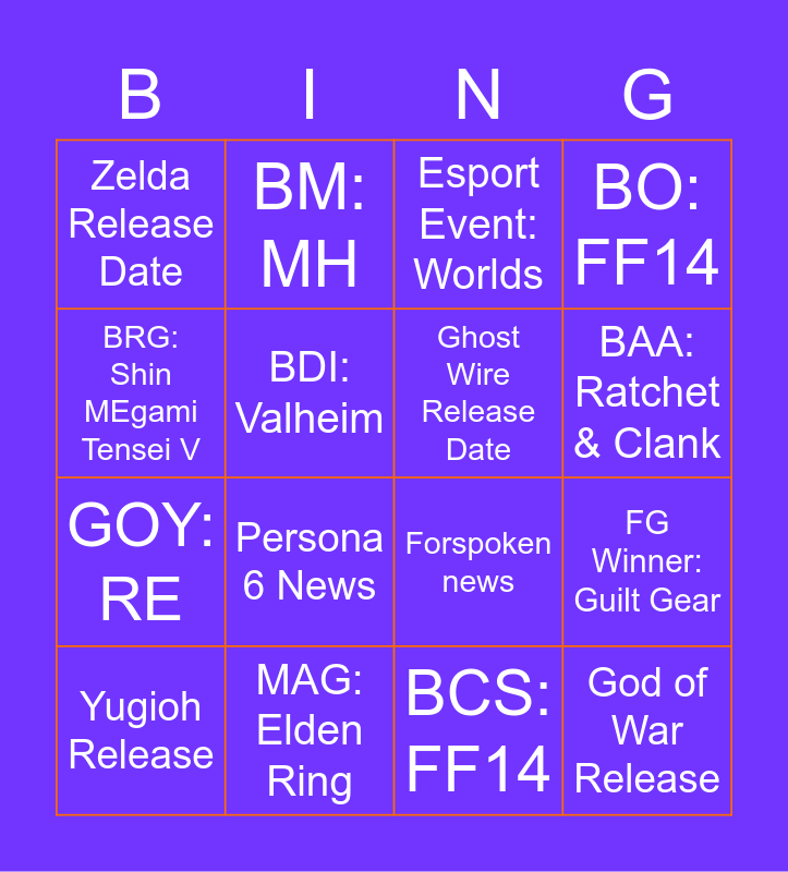 This bingo card has 16 words: Yugioh Release, MAG: Elden Ring, Esport Event: Worlds, BO: FF14, BRG: Shin MEgami Tensei V, BM: MH, Forspoken news, FG Winner: Guilt Gear, Zelda Release Date, BDI: Valheim, BCS: FF14, BAA: Ratchet & Clank, GOY: RE, Persona 6 News, Ghost Wire Release Date and God of War Release.