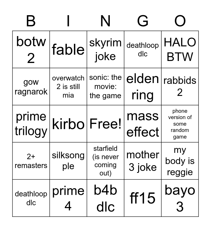 This bingo card has a free space and 24 words: silksong ple, prime 4, sonic: the movie: the game, deathloop dlc, HALO BTW, botw 2, gow ragnarok, fable, mass effect, starfield (is never coming out), elden ring, prime trilogy, mother 3 joke, my body is reggie, overwatch 2 is still mia, ff15, phone version of some random game, skyrim joke, rabbids 2, kirbo, bayo 3, 2+ remasters, deathloop dlc and b4b dlc.