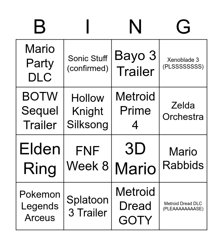 This bingo card has 16 words: Splatoon 3 Trailer, Mario Rabbids, Bayo 3 Trailer, Mario Party DLC, Elden Ring, Sonic Stuff (confirmed), 3D Mario, Metroid Dread GOTY, BOTW Sequel Trailer, Hollow Knight Silksong, Pokemon Legends Arceus, Xenoblade 3 (PLSSSSSSSS), FNF Week 8, Zelda Orchestra, Metroid Prime 4 and Metroid Dread DLC (PLEAAAAAAAASE).
