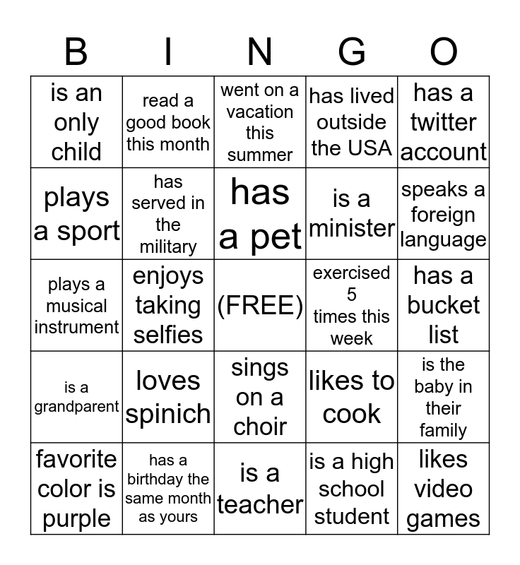 This bingo card has a free space and 24 words: loves spinich, has a birthday the same month as yours, has a pet, favorite color is purple, has a twitter account, is an only child, plays a sport, read a good book this month, exercised 5 times this week, sings on a choir, is a minister, plays a musical instrument, likes to cook, is the baby in their family, has served in the military, is a high school student, has a bucket list, went on a vacation this summer, speaks a foreign language, enjoys taking selfies, likes video games, is a grandparent, has lived outside the USA and is a teacher.