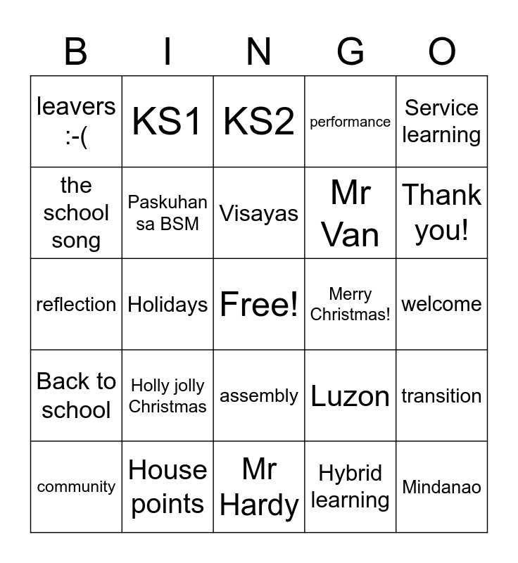This bingo card has a free space and 24 words: Holly jolly Christmas, House points, Visayas, community, Service learning, leavers :-(, the school song, KS1, Merry Christmas!, assembly, Mr Van, reflection, Luzon, transition, Paskuhan sa BSM, Hybrid learning, welcome, KS2, Thank you!, Holidays, Mindanao, Back to school, performance and Mr Hardy.