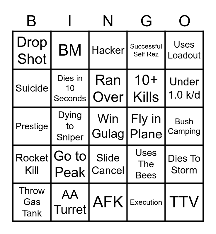 This bingo card has a free space and 24 words: Go to Peak, AA Turret, Ran Over, Throw Gas Tank, Uses Loadout, Drop Shot, Suicide, BM, Fly in Plane, Slide Cancel, 10+ Kills, Prestige, Uses The Bees, Dies To Storm, Dies in 10 Seconds, Execution, Bush Camping, Hacker, Under 1.0 k/d, Dying to Sniper, TTV, Rocket Kill, Successful Self Rez and AFK.