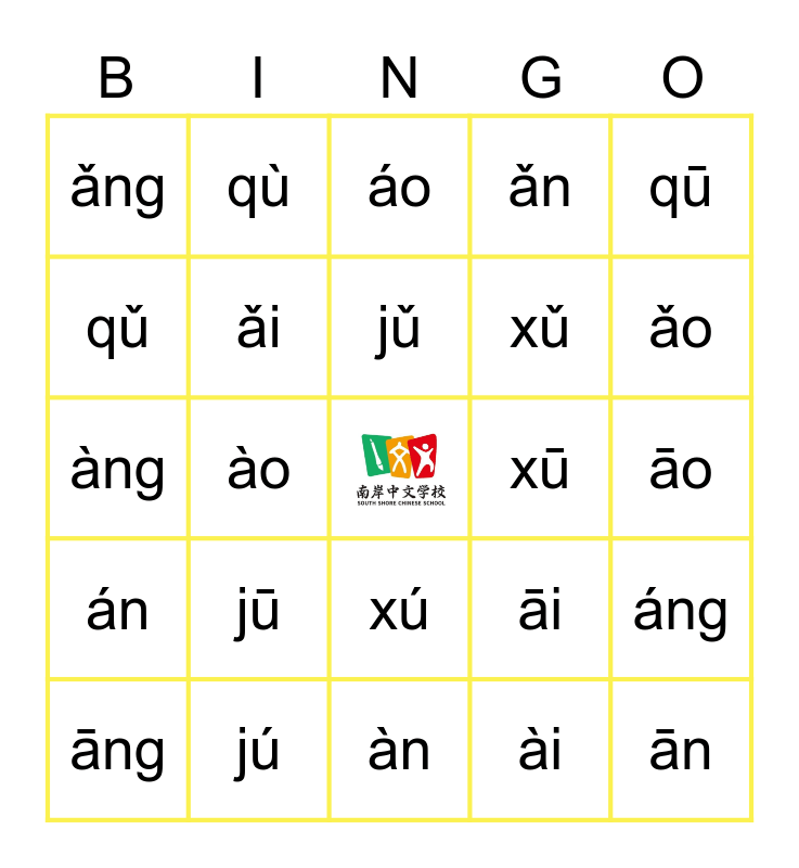 This bingo card has a free space and 24 words: jū, jú, jǔ, āng, qū, ǎng, qǔ, qù, xū, xú, xǔ, àng, āi, áng, ǎi, ài, āo, áo, ǎo, ào, ān, án, ǎn and àn.