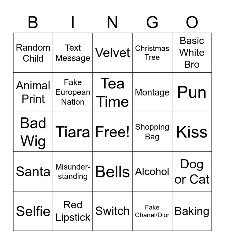 This bingo card has a free space and 24 words: Misunder-standing, Red Lipstick, Tea Time, Selfie, Basic White Bro, Random Child, Animal Print, Text Message, Shopping Bag, Bells, Montage, Bad Wig, Alcohol, Dog or Cat, Fake European Nation, Fake Chanel/Dior, Kiss, Velvet, Pun, Tiara, Baking, Santa, Christmas Tree and Switch.
