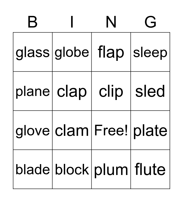 This bingo card has 19 words: Free!, flag, flap, flute, plate, plane, plum, glass, globe, glove, clam, clap, clip, block, blade, black, sleep, sled and slide.