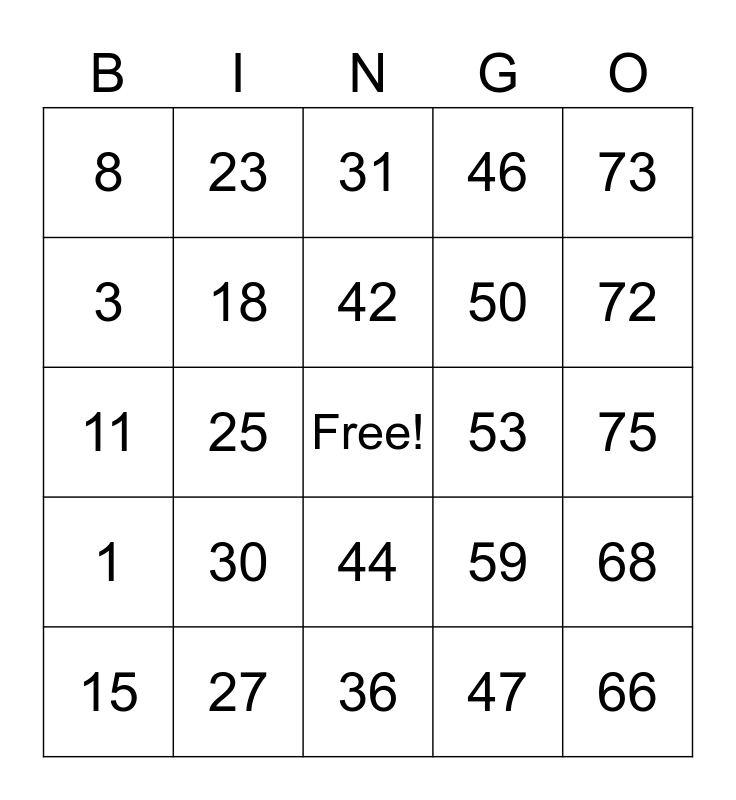 This bingo card has a free space and 24 words: 15, 30, 42, 47, 73, 8, 23, 31, 53, 75, 11, 18, 59, 68, 3, 27, 36, 46, 72, 1, 25, 44, 50 and 66.