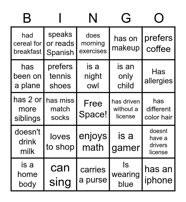 This bingo card has a free space and 34 words: is married, Is wearing blue, Likes Broccoli, likes roller coasters, doesn't drink milk, prefers tennis shoes, prefers coffee, is a home body, speaks or reads Spanish, completed something on their bucket list, is a night owl, does morning exercises, is scared of the dark, has been arrested, has driven without a license, Has allergies, can sing, has 2 or more siblings, loves to shop, is a gamer, enjoys math, has pets, had cereal for breakfast, has different color hair, carries a purse, has an iphone, has on makeup, knows psalms 23 by heart, is an only child, has been on a plane, has worked at Mcdonalds, has miss match socks, doesnt have a drivers license and is afraid of spiders.