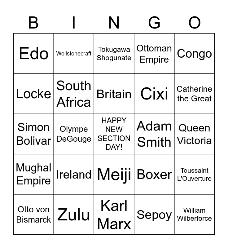 This bingo card has a free space and 26 words: Meiji, Sepoy, Britain, Zulu, Congo, Edo, Locke, Wollstonecraft, Queen Victoria, Boxer, Cixi, Simon Bolivar, Toussaint L'Ouverture, Otto von Bismarck, Olympe DeGouge, Baron de Montesquieu, Ottoman Empire, Mughal Empire, Tokugawa Shogunate, William Wilberforce, Catherine the Great, Karl Marx, Adam Smith, Ireland, South Africa and Ethiopia.