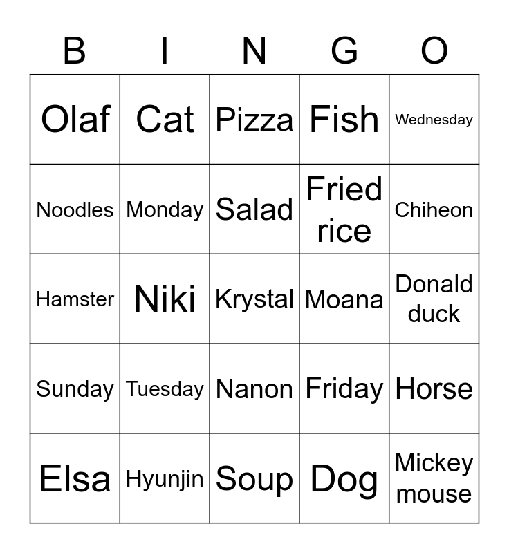 This bingo card has a free space and 24 words: Tuesday, Hyunjin, Salad, Elsa, Wednesday, Olaf, Noodles, Cat, Moana, Nanon, Fried rice, Hamster, Friday, Horse, Monday, Dog, Donald duck, Pizza, Chiheon, Niki, Mickey mouse, Sunday, Fish and Soup.