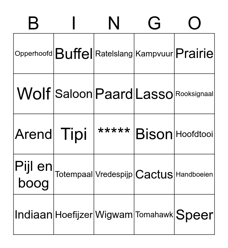 This bingo card has a free space and 39 words: Huifkar, Pistool, Cowboy, Saloon, Indiaan, Vredespijp, Paard, Adelaar, Prairie, Pijl en boog, Tipi, Kampvuur, Speer, Hoofdtooi, Bison, Totempaal, Regenmaker Dromenvanger, Opperhoofd, Sheriff, Cactus, Wolf, Wigwam, Lasso, Rooksignaal, Laarzen, Kano, Veer, Hoed, Holster, Buffel, Goudmijn, Stoomtrein, Ratelslang, Hoefijzer, Tomahawk, Geweer, Handboeien, Arend and Farm.