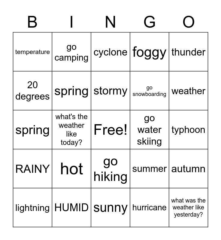 This bingo card has a free space and 24 words: hot, HUMID, stormy, lightning, thunder, temperature, 20 degrees, go camping, go water skiing, go hiking, go snowboarding, spring, summer, autumn, spring, hurricane, typhoon, cyclone, weather, what's the weather like today?, what was the weather like yesterday?, RAINY, foggy and sunny.