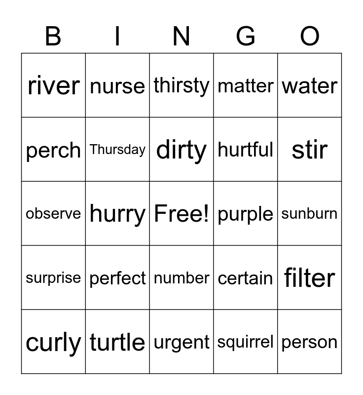 This bingo card has a free space and 24 words: perfect, turtle, dirty, curly, water, river, perch, nurse, purple, number, hurtful, observe, certain, filter, Thursday, squirrel, sunburn, thirsty, stir, hurry, person, surprise, matter and urgent.