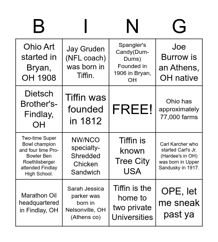 This bingo card has 16 words: Sarah Jessica parker was born in Nelsonville, OH (Athens co), Carl Karcher who started Carl's Jr. (Hardee's in OH) was born in Upper Sandusky in 1917., Spangler's Candy(Dum-Dums) Founded in 1906 in Bryan, OH, Ohio Art started in Bryan, OH 1908, Two-time Super Bowl champion and four time Pro-Bowler Ben Roethlisberger attended Findlay High School., Jay Gruden (NFL coach) was born in Tiffin., Tiffin is known Tree City USA, Tiffin is the home to two private Universities, Dietsch Brother's- Findlay, OH, Tiffin was founded in 1812, Marathon Oil headquartered in Findlay, OH, Joe Burrow is an Athens, OH native, NW/NCO specialty- Shredded Chicken Sandwich, Ohio has approximately 77,000 farms, FREE! and OPE, let me sneak past ya.