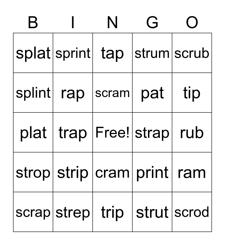 This bingo card has a free space and 25 words: strip, trip, scram, scrap, scrub, splat, splint, sprint, strap, cram, pat, plat, print, ram, rap, rip, rub, tap, tip, trap, scrod, strep, strop, strum and strut.