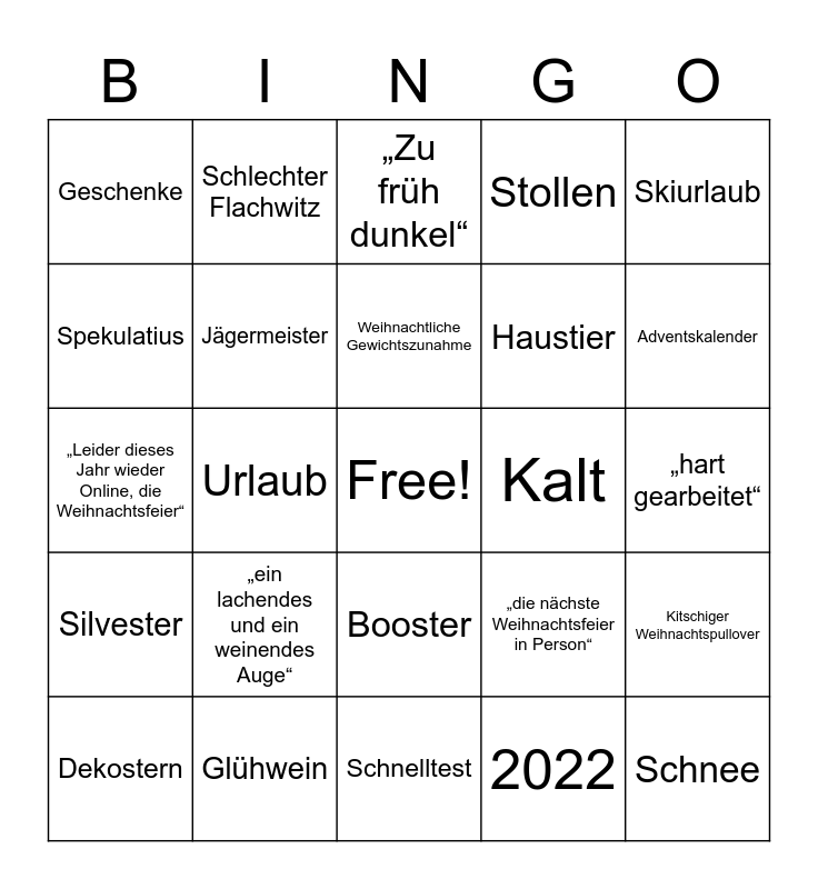 This bingo card has a free space and 60 words: Nikolaus Mütze, Glühwein, Weihnachtsmarkt, Silvester, 2022, Weihnachtsbaum im Bild, Jägermeister, Kind läuft durch Kamera, Haustier, „2G+“, Stollen, Volkswagen, Spekulatius, „Selbstgebackene Plätzchen“, Kerzen im Bild, Geschenke, Schnee, Skiurlaub, unangenehmes Schweigen, Weihnachtliche Gewichtszunahme, Kalt, „Zu früh dunkel“, Dekostern, Kitschiger Weihnachtspullover, Lichterkette, Harz, Olaf Scholz, Angela Merkel, Adventskalender, Bierflasche öffnen, Internetprobleme, Getränk mit Schuss, Seltsame Weihnachtstradition, Lallender Kollege, Schlechter Flachwitz, Langlauf, Sommer, Urlaub, „Endspurt“, „Leider dieses Jahr wieder Online, die Weihnachtsfeier“, „Früher war alles besser“ – Bezug auf Weihnachtsfeier, „ein lachendes und ein weinendes Auge“, „hart gearbeitet“, „wir wollen gemeinsam besser werden“, „die nächste Weihnachtsfeier in Person“, Beschaffungsantrag, Segeln, Radtour, Zeitausgleich, Booster, Schnelltest, Glatze, Weihnachtsmann, Grinch, Schummeln beim Spielen, Mikro gemuted, Hintergrundgeräusche, Masken, Unordentliches Zimmer and an Getränk verbrennen.