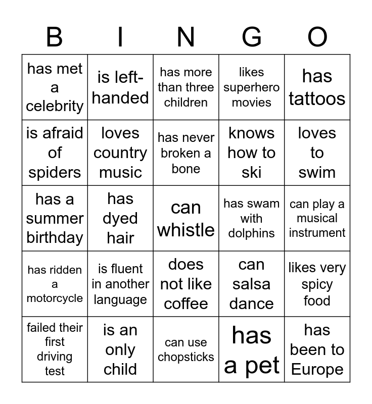 This bingo card has 25 words: is fluent in another language, can use chopsticks, has never broken a bone, failed their first driving test, has tattoos, has met a celebrity, is afraid of spiders, is left-handed, has swam with dolphins, does not like coffee, knows how to ski, has a summer birthday, can salsa dance, likes very spicy food, loves country music, has been to Europe, can play a musical instrument, has more than three children, loves to swim, has dyed hair, can whistle, is an only child, has ridden a motorcycle, likes superhero movies and has a pet.
