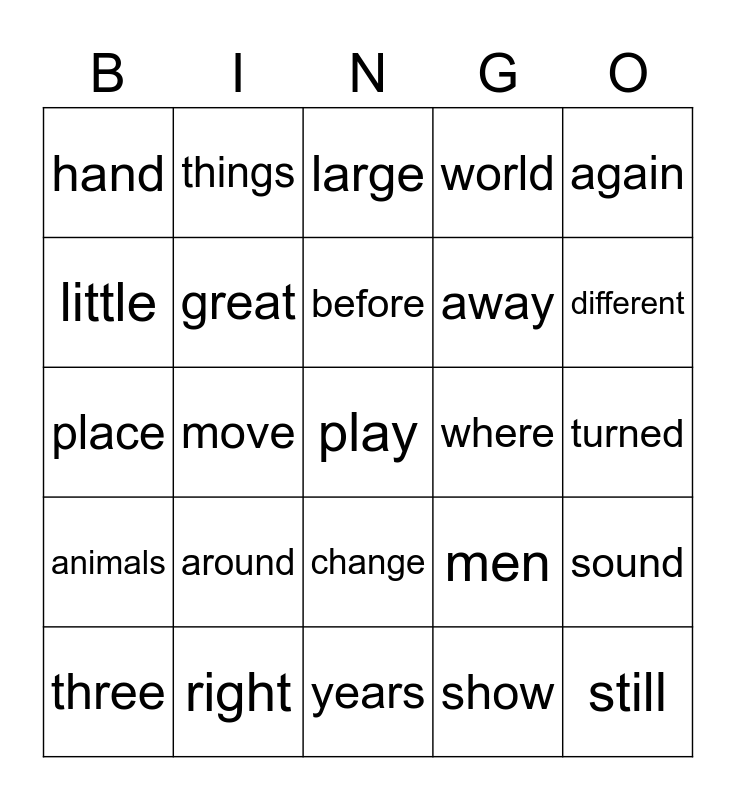 This bingo card has 25 words: around, years, before, three, again, hand, little, things, where, change, away, place, men, sound, great, still, turned, large, different, move, play, right, animals, world and show.